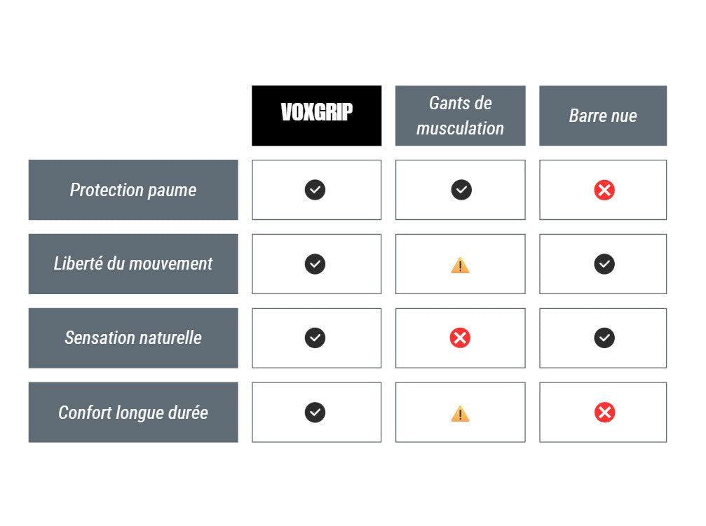 VoxGrip réduit les frottements et répartit la pression dans la paume, limitant ampoules et irritations. Vous enchaînez les séances avec des mains préservées et une régularité qui facilite la progression, sans douleur inutile.